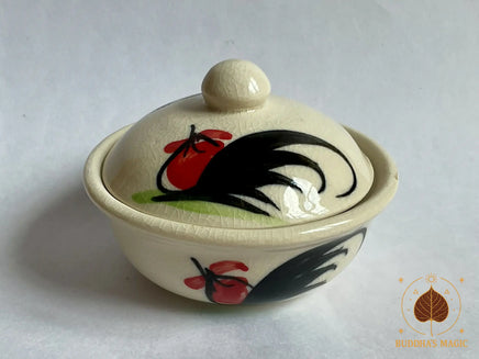 • Reliquaire : Reliquaire neuf en céramique décorée, motif traditionnel coq de combat