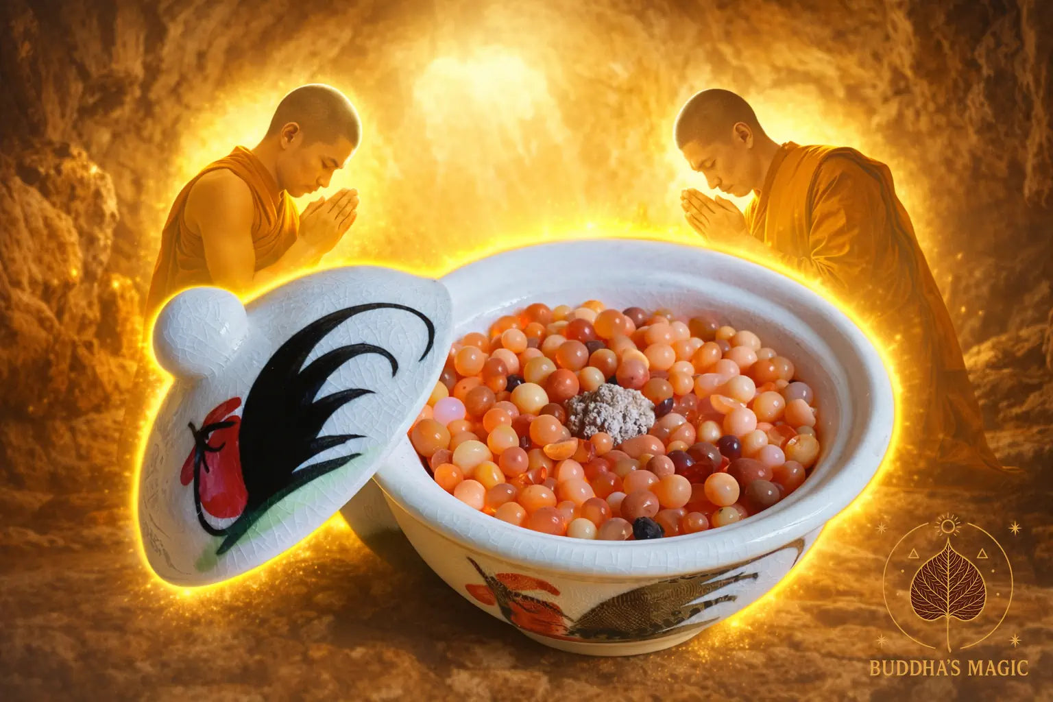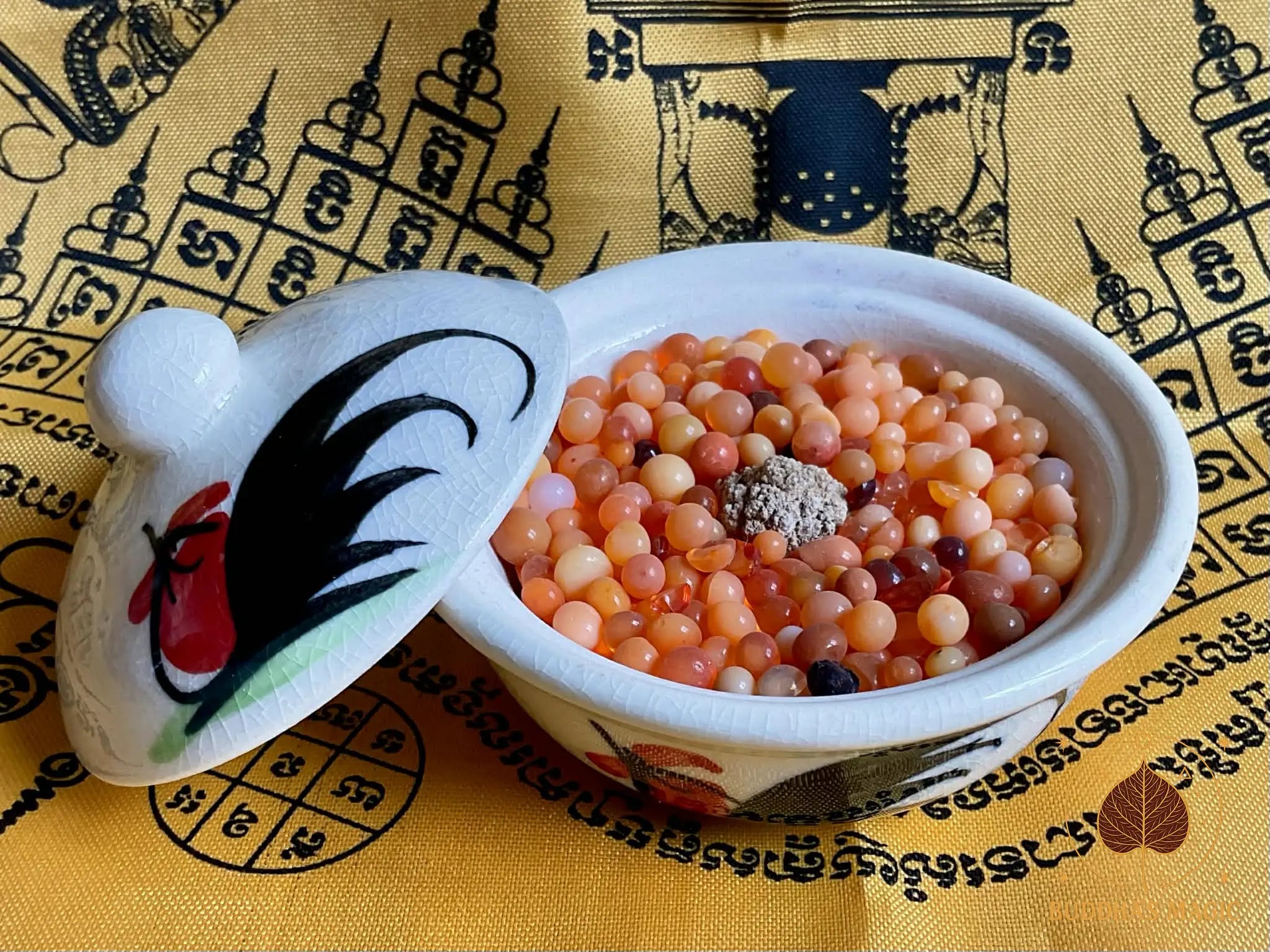 Ces perles Sarira aux reflets solaires portent la mémoire silencieuse de la pratique et du mérite accumulé. Associées à la pierre Hin Phra Siwali, elles forment un noyau d’énergie douce mais constante, favorable à la protection, à l’harmonie et à l’abondance juste. Le coq veille, annonce l’aube et repousse l’obscurité.