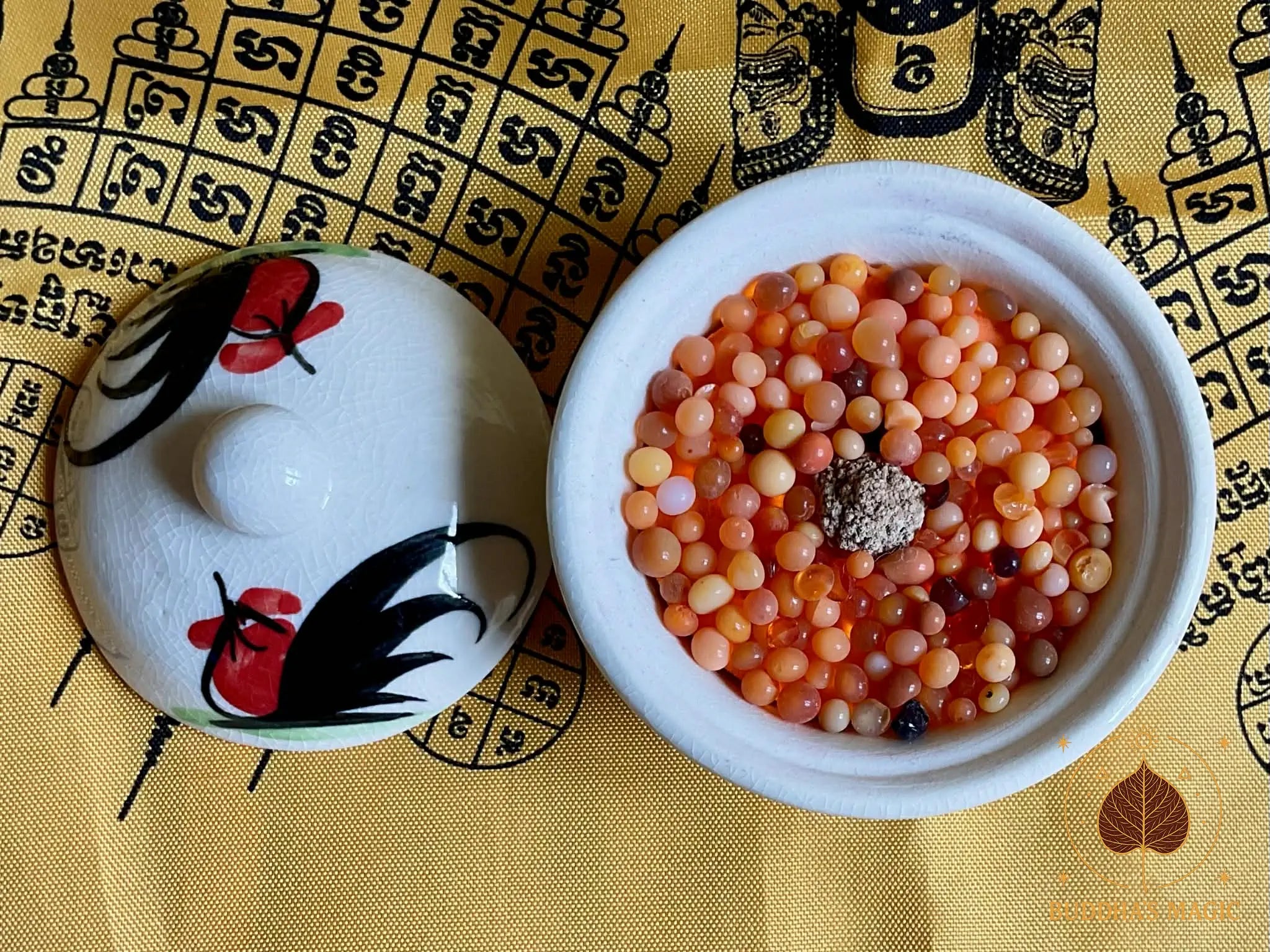 À l’intérieur reposent de véritables perles reliques Sarira aux teintes ambrées et orangées, formées naturellement lors de processus spirituels associés à la pratique et à la consécration. Chaque perle est unique par sa couleur, sa translucidité et sa vibration subtile.