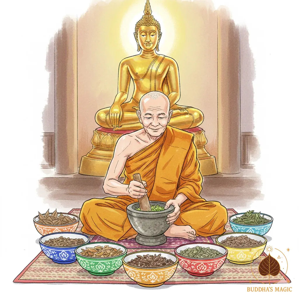 Chaque ingrédient végétal est sélectionné pour ses propriétés spirituelles liées à la santé, la longévité, l’équilibre des énergies et la protection. Les plantes sont séchées, réduites en poudre et mélangées lors de rituels bouddhistes, accompagnés de prières et d’invocations traditionnelles.