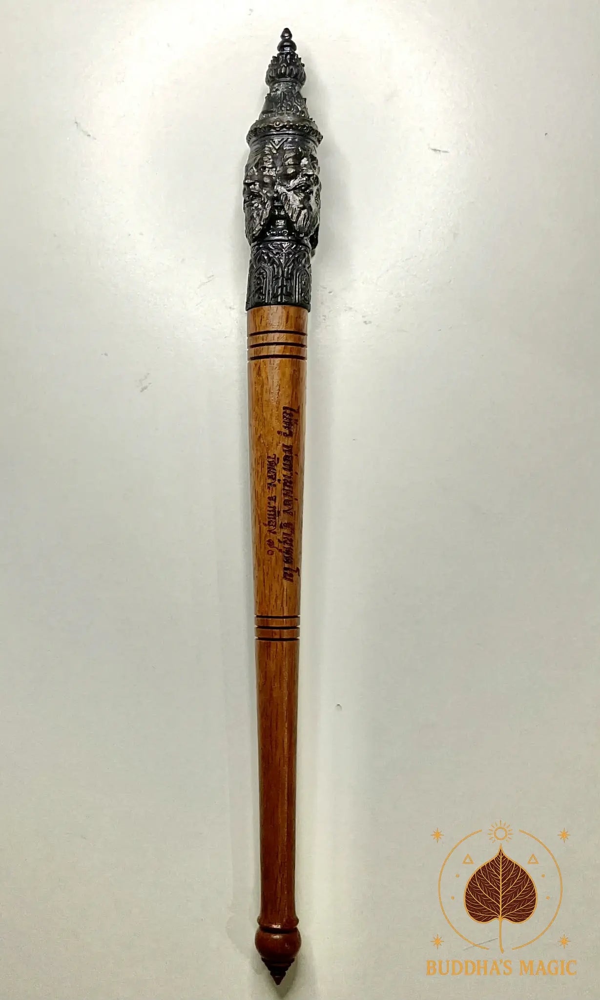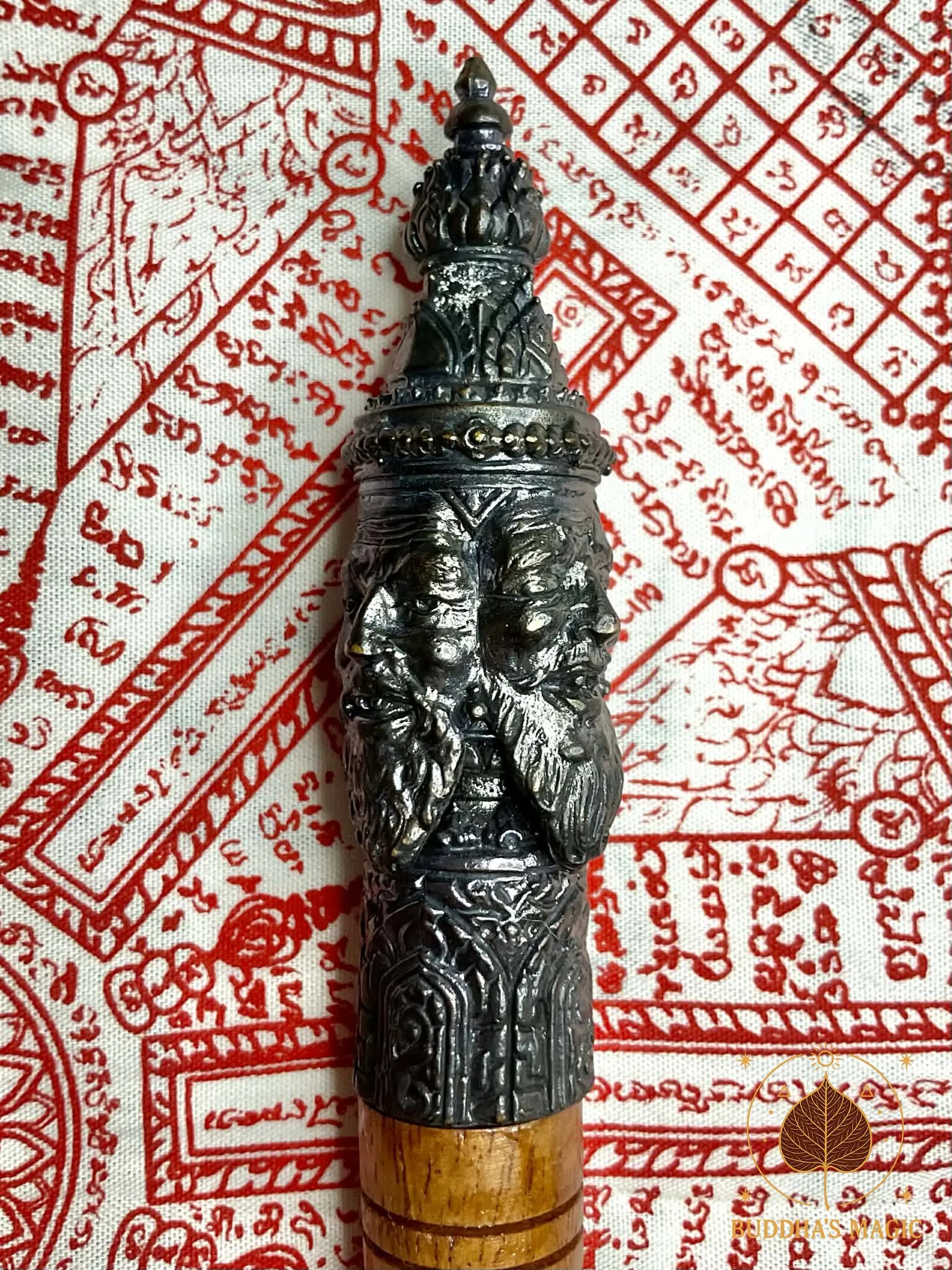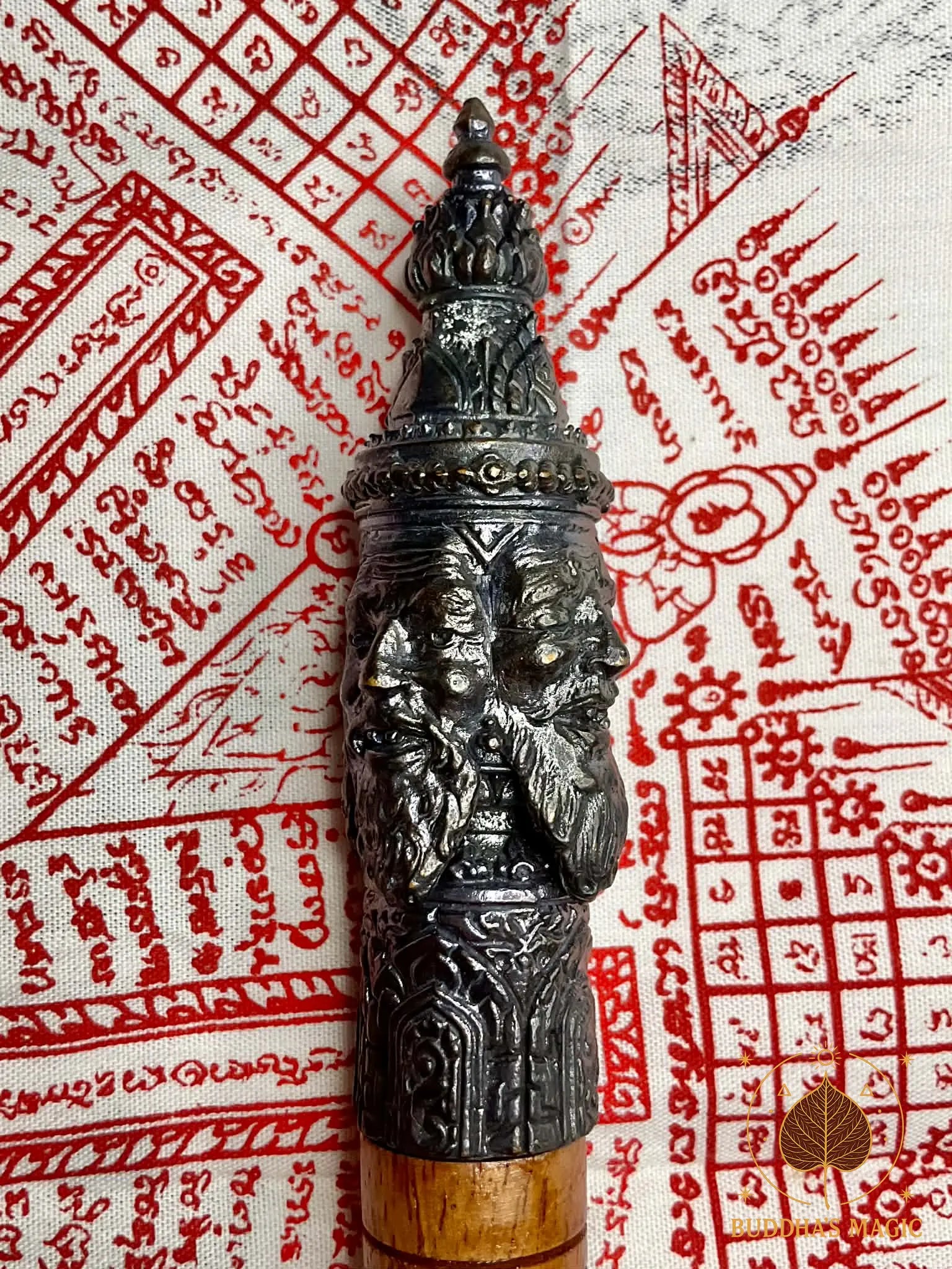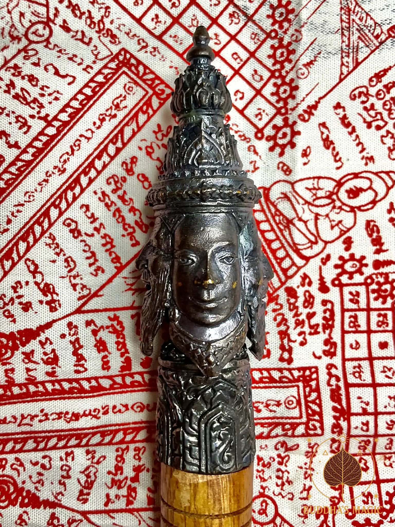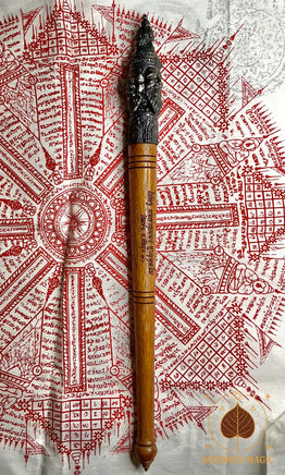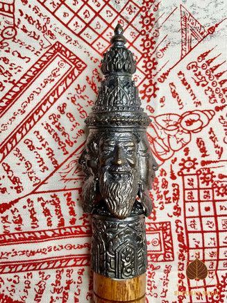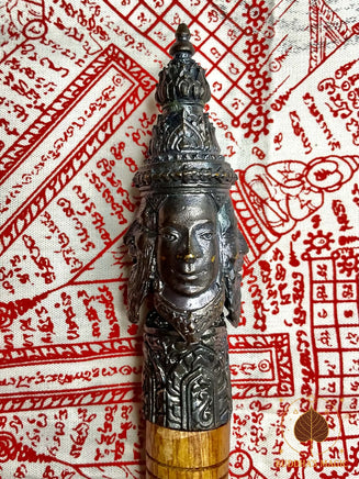 La tête du sceptre est en métal alchimique Loh Dam et représente Phra Phrom (Brahma), symbole de prospérité, d’équilibre cosmique, de protection et d’accomplissement. Le corps est en bois rituel, avec inscription bénie et finition traditionnelle. Cet objet spirituel est historiquement utilisé dans les rituels de bénédiction, d’ouverture de cérémonie sak yant, de consécration d’amulettes et de protections karmiques.