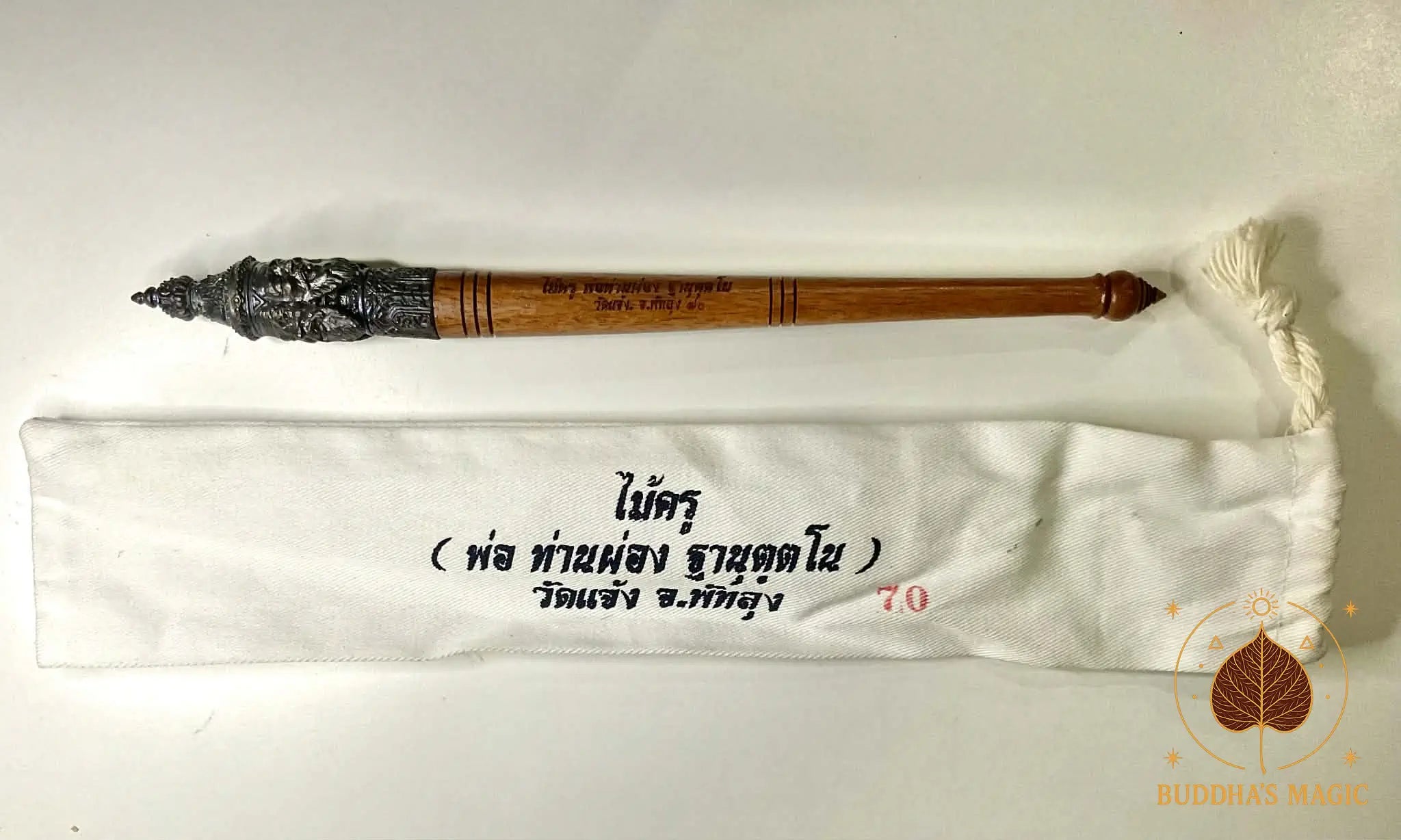 🕯 À propos des sceptres Mae Kru Les Mae Kru sont des baguettes sacrées utilisées par les maîtres pour tracer les bénédictions dans l’air, éveiller la puissance d’une amulette, ouvrir ou clore un rituel, inviter les devas et consacrer un autel. Elles canalisent l’intention et servent de pont entre le visible et l’invisible. Leur usage permet de diriger l’énergie, purifier un lieu et transmettre la baramee (puissance spirituelle) du maître. Une Mae Kru authentique n’est jamais un simple objet : elle devient l’instrument vivant du rite.