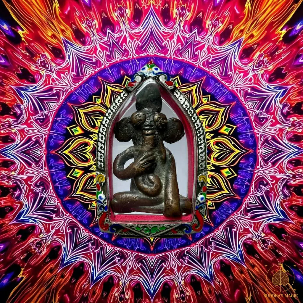 Amulet mounted in a reliquary decorated with traditional motifs, protecting the piece while respecting its ancient character.