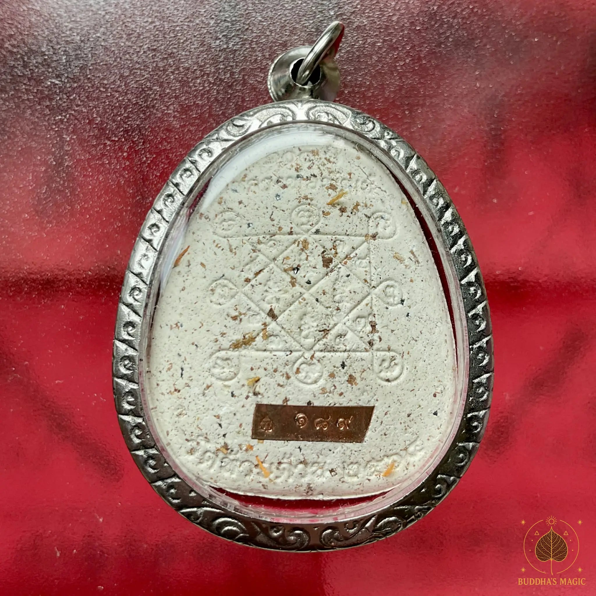 On the back of the amulet is the powerful Trinisinghae Yant , a sacred protective diagram composed of geometric lines and mystical characters. This yant is traditionally used to strengthen spiritual authority, repel negative energies, and stabilize prosperity. It acts as a subtle armor around the wearer.