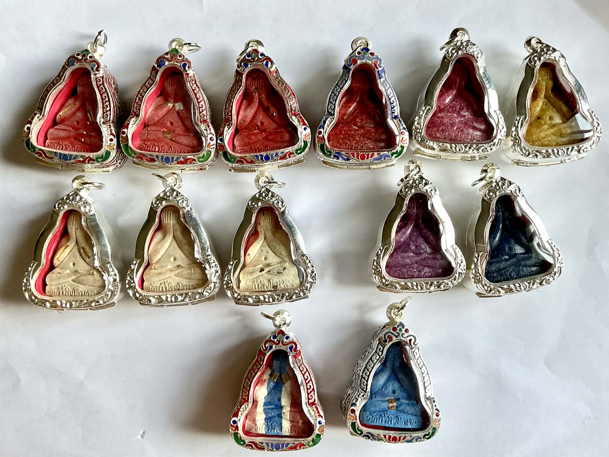 Some of these amulets are made of colored sacred powder (with in some cases the addition of takut and Phratat relic stones), others are made of colored Phratat sacred stones agglomerated with resin.