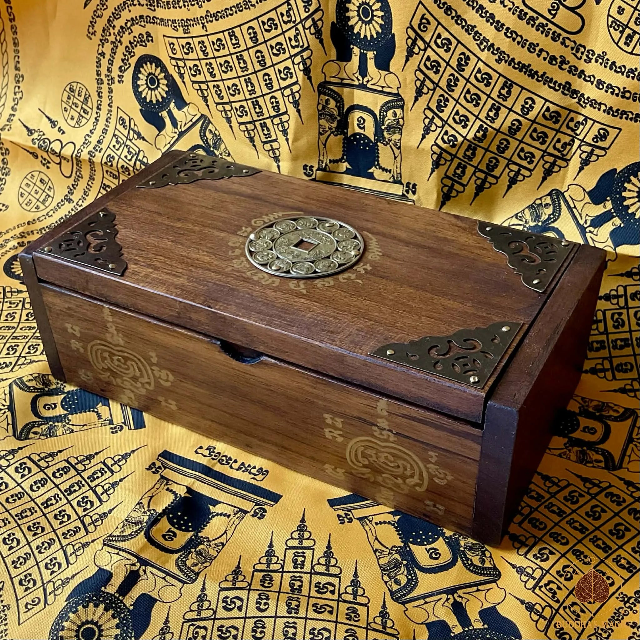 New , solid wood ritual box for amulets , in traditional Chinese style, designed and consecrated by a young Ajarn from the Wat Sakai lineage . This sacred box was conceived as a true energy support intended to strengthen, protect, and recharge the amulets placed within it.