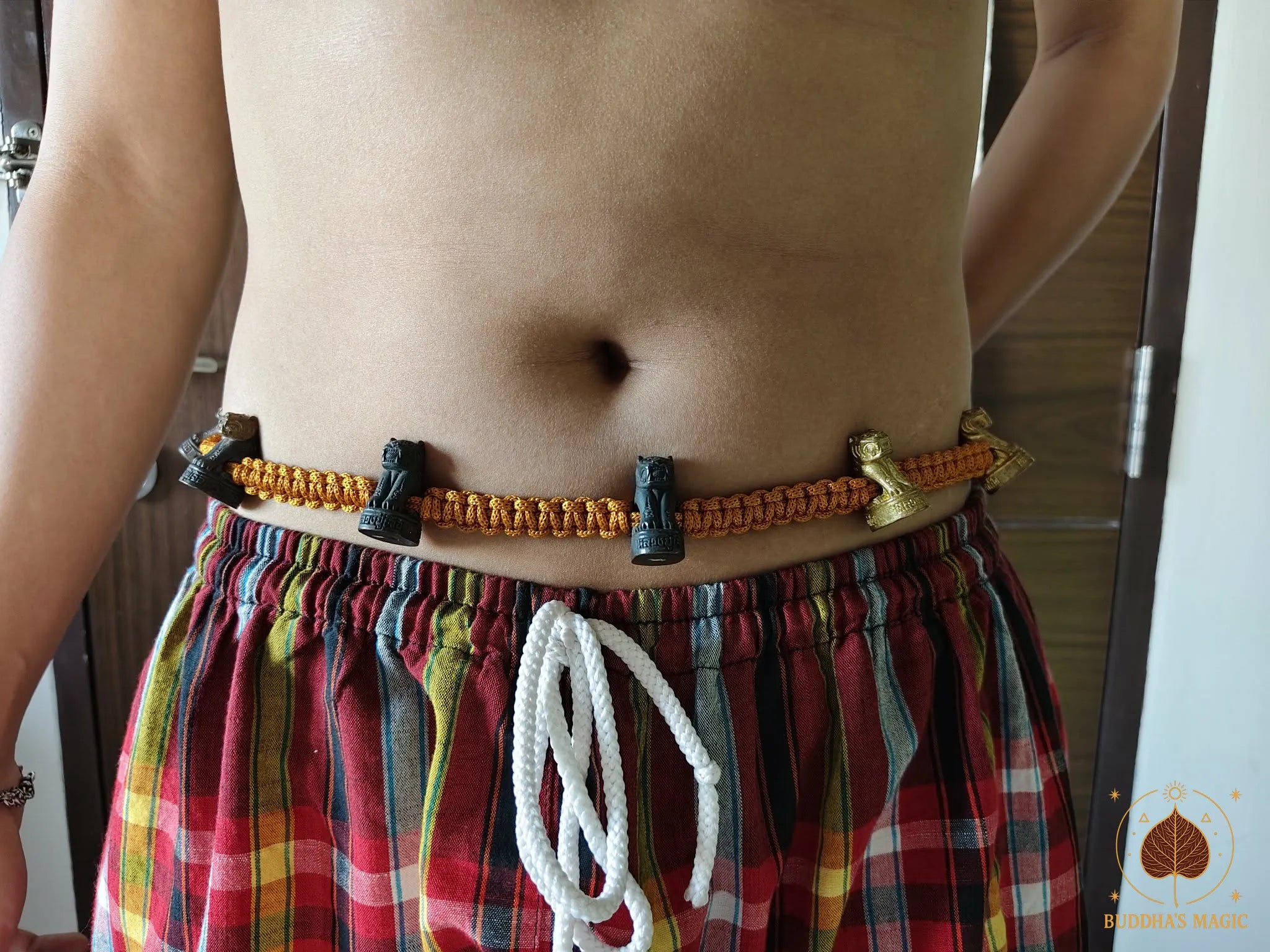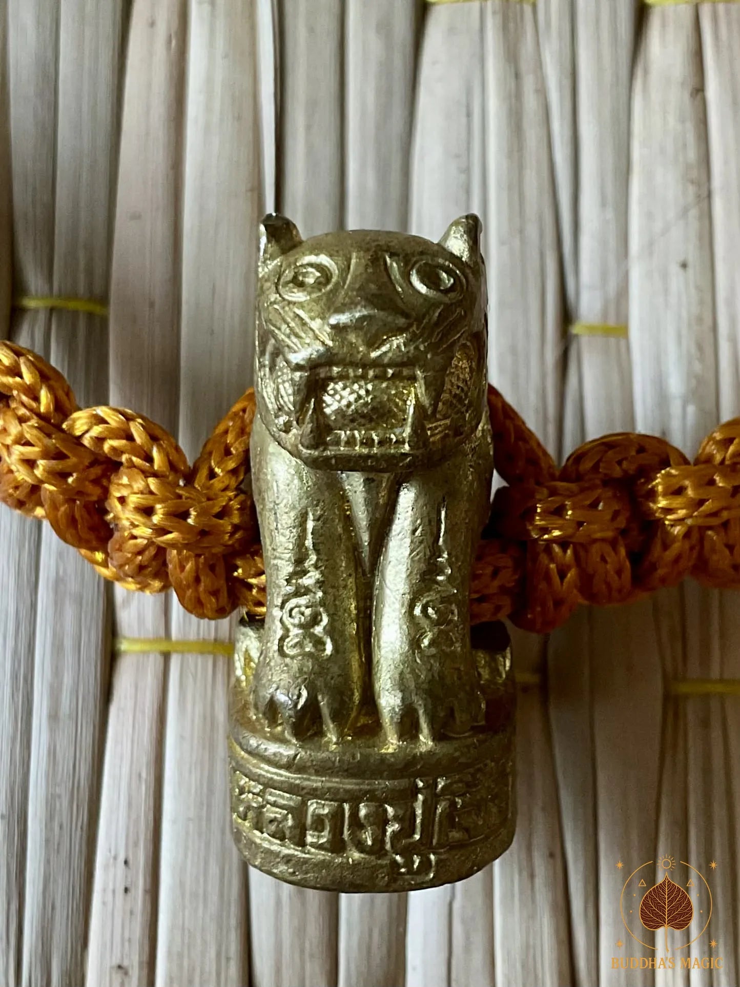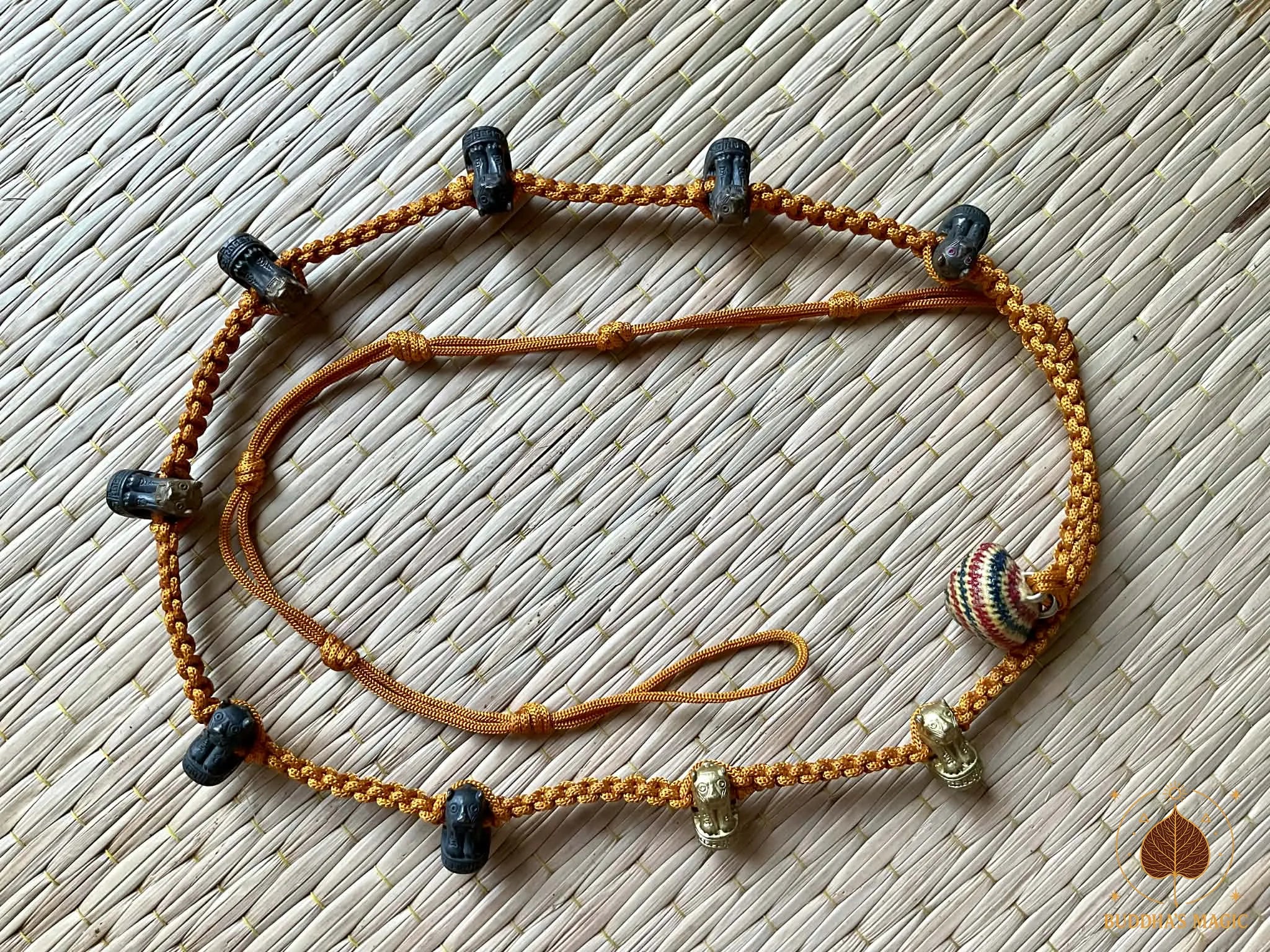 The belt is composed of nine tiger amulets of various designs, each representing the protective energy and vigilance of the tiger, combined with a Bia Gae amulet , traditionally used as a shield against black magic, malevolent spirits, and harmful occult influences.
