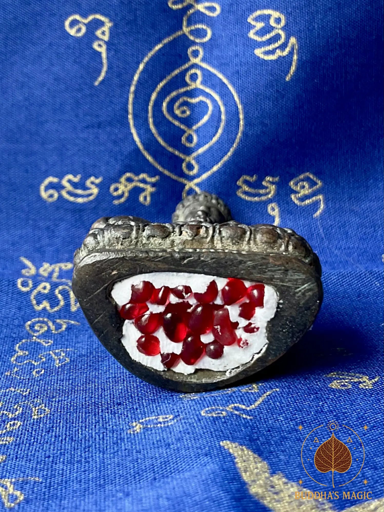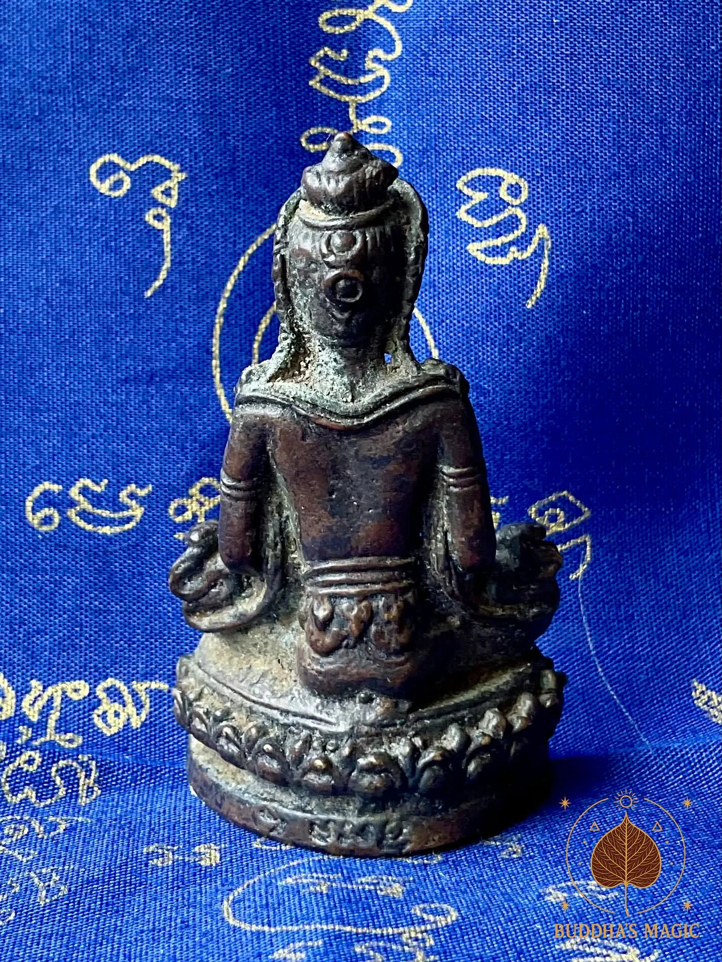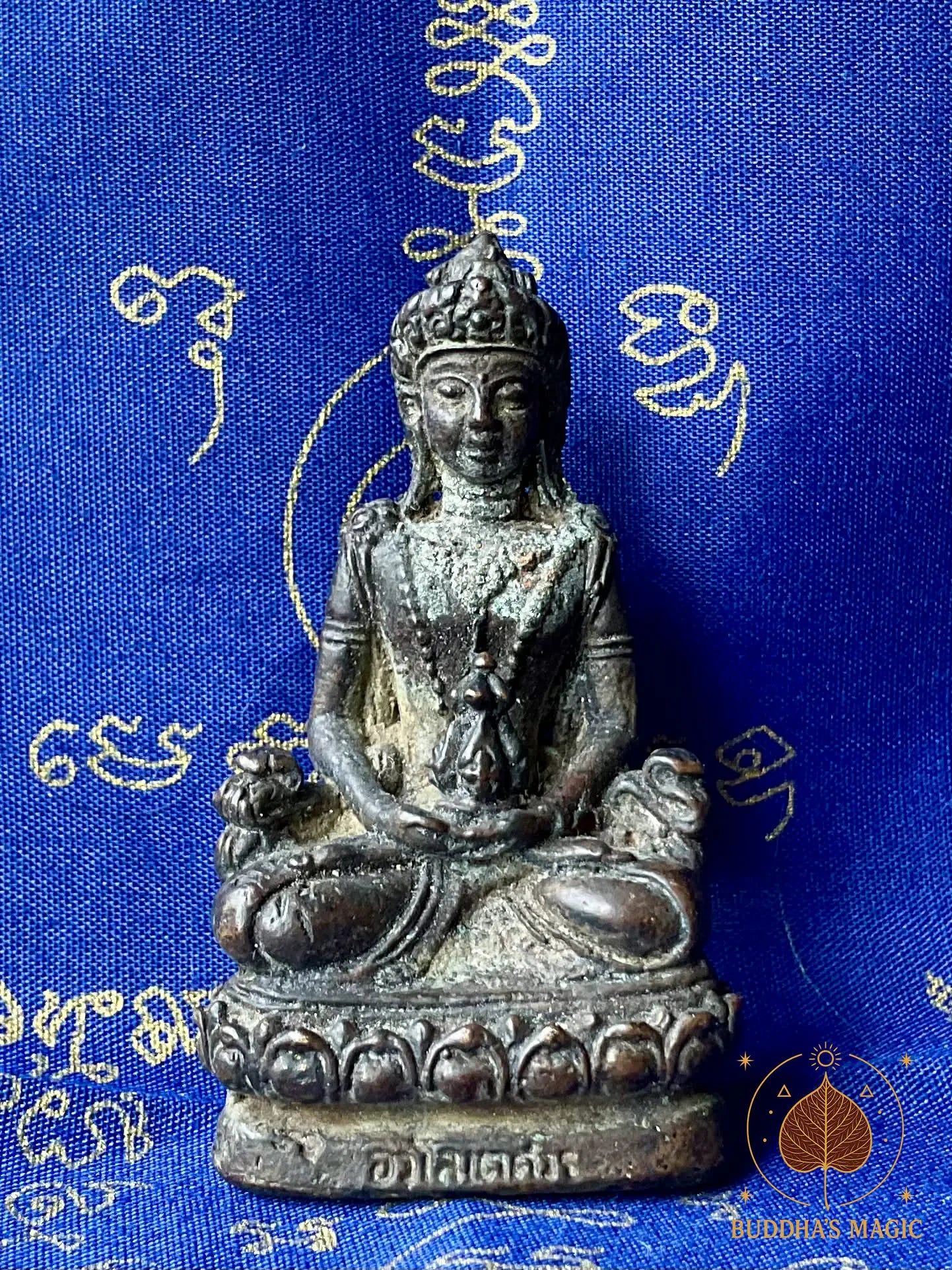 The central element is an ancient dark bronze statuette depicting Amitayus , the Tibetan Buddha of longevity. Seated in a meditative posture, he embodies longevity, spiritual vitality, and the accumulation of merit. His patinated appearance testifies to his age and devotional use. Red Phratat relic stones are found in the base of this statuette.