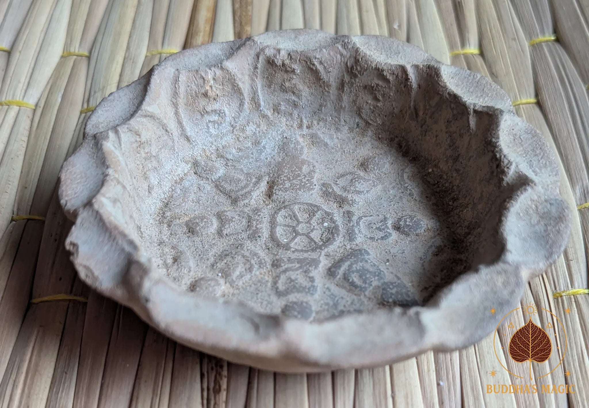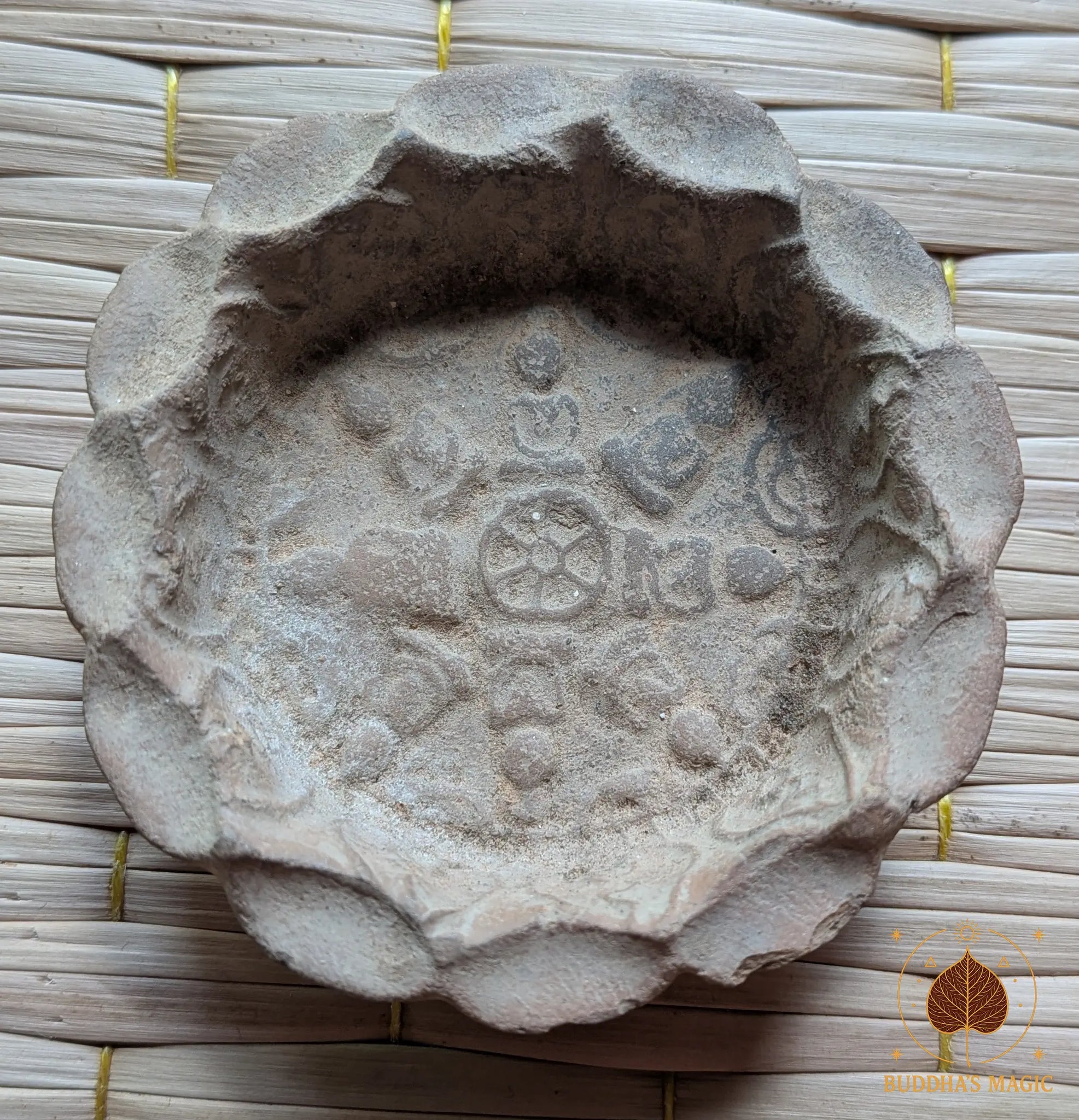 The statuette is accompanied by an ancient terracotta ritual cup , hand-shaped and decorated inside with eight Buddhas arranged in a circle around a Dharma wheel (Dharmachakra) . This iconography evokes the Noble Eightfold Path and the dissemination of the Buddha's teachings in the eight directions.