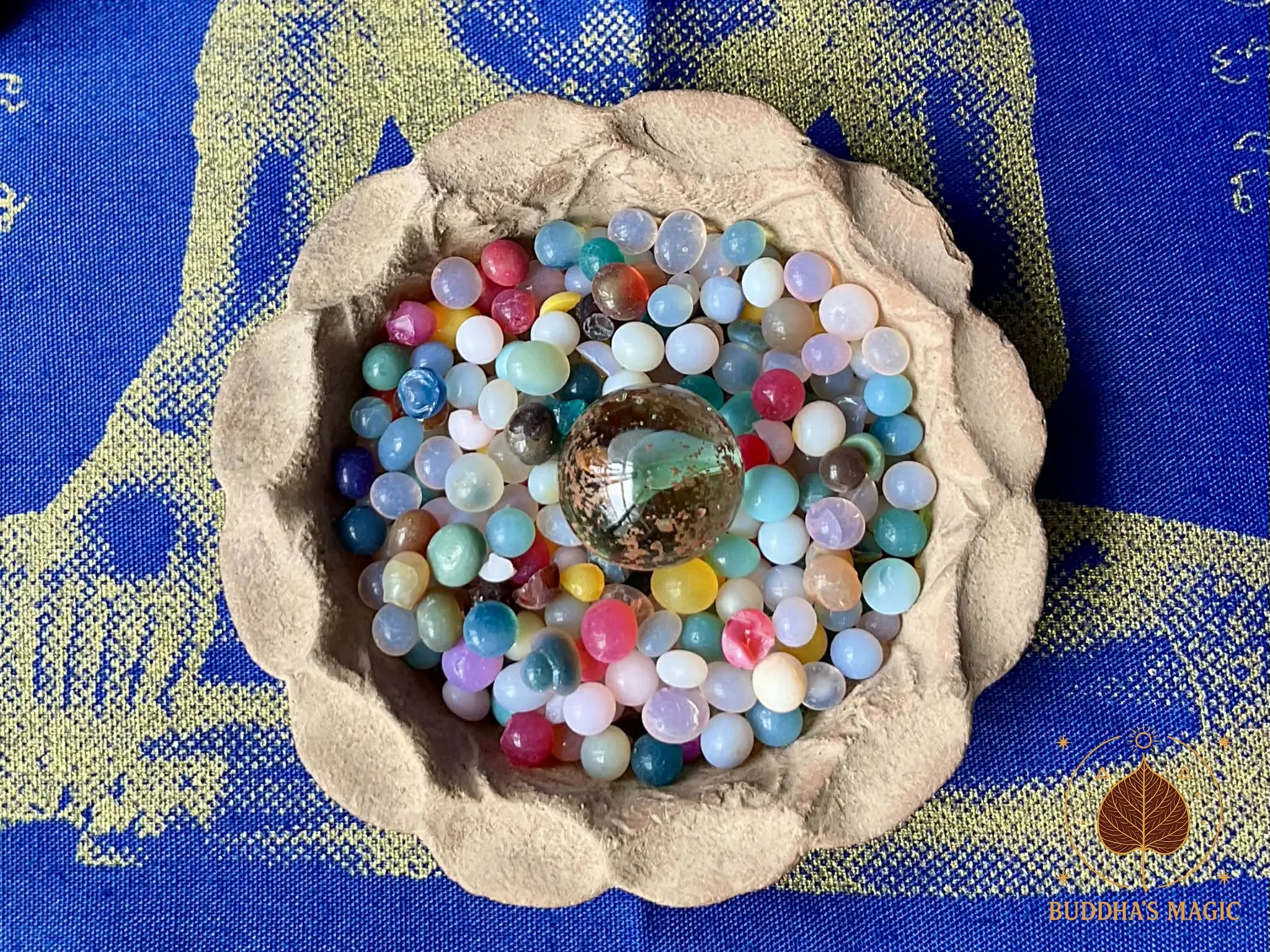 The cup contains a set of multicoloured Ringsel relic beads (Sarira) , as well as a sacred Look Geow glass bead , a symbol of purity, protection and spiritual clarity.