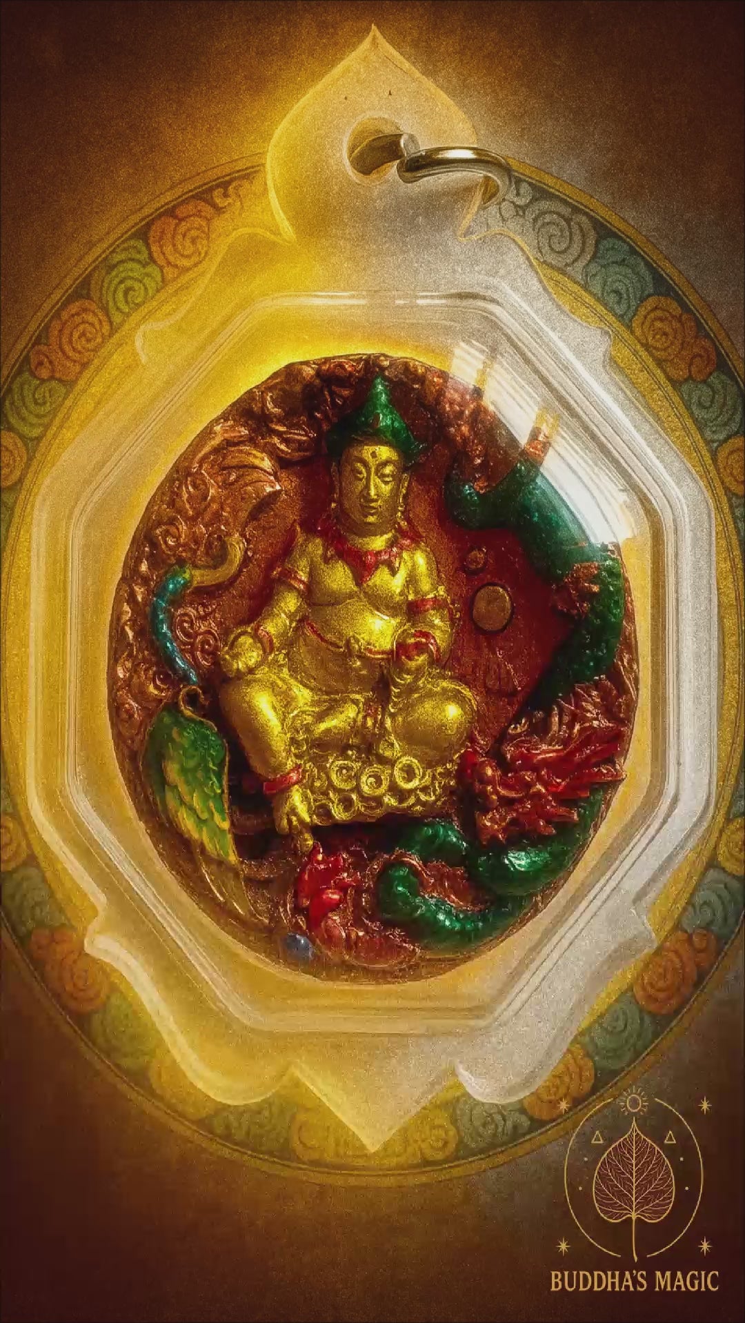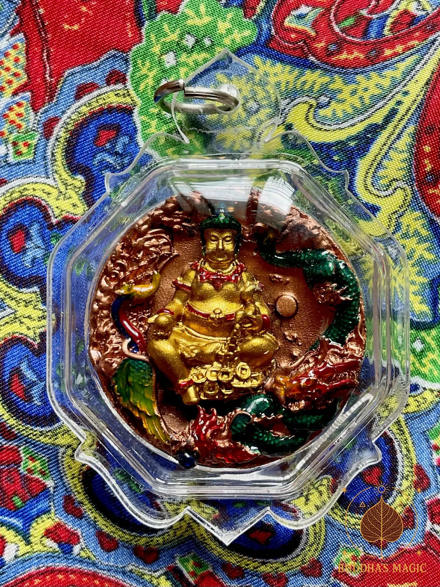 This is a beautiful amulet depicting Kubera/Jamballa , the Tibetan Buddha of wealth, prosperity, and material stability. It was consecrated in 2017 by the venerable Luang Phor Lek (Phra Thanabodee) of Wat Tham Khao Noi (Phetchaburi province), a master renowned for his powerful blessings and prosperity rituals.