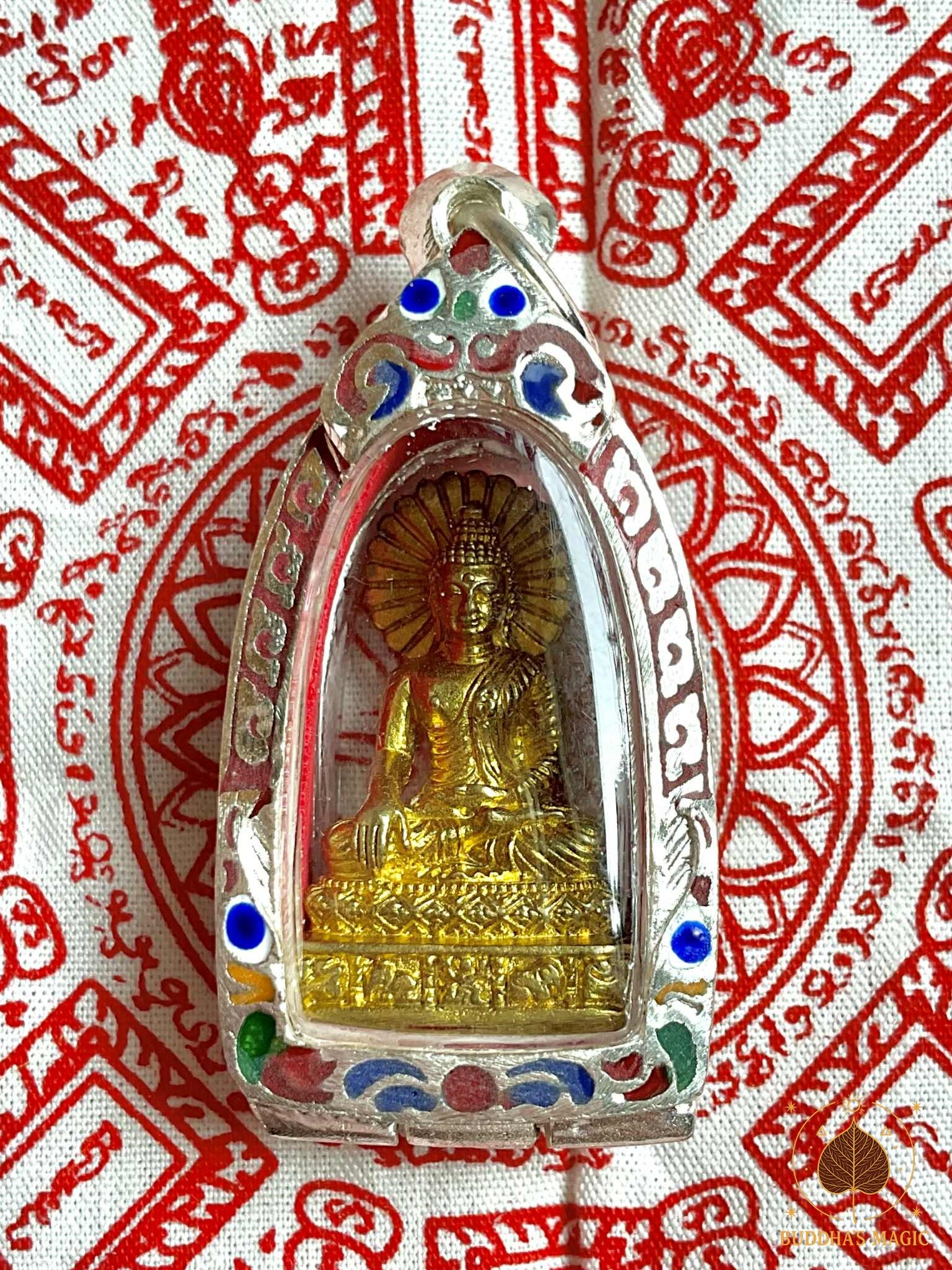 It represents the Buddha of Mahabodhi , a symbol of universal compassion and victory over ignorance. The golden glow of the statuette evokes the inner light of wisdom, while the blessings received during the ceremony aim to attract kindness, harmony, and peace into the heart of the wearer.